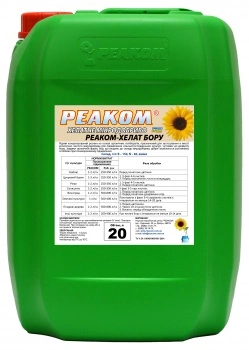 РЕАКОМ-ХЕЛАТ БОРУ - це рідка композиція з бором в органічній формі, легкої для засвоєння рослинами. Цей мікроелемент безпосередньо відповідає за утворення пилку, зав'язь та зростання плоду, а також бере участь у транспортуванні цукрів у рослинах.